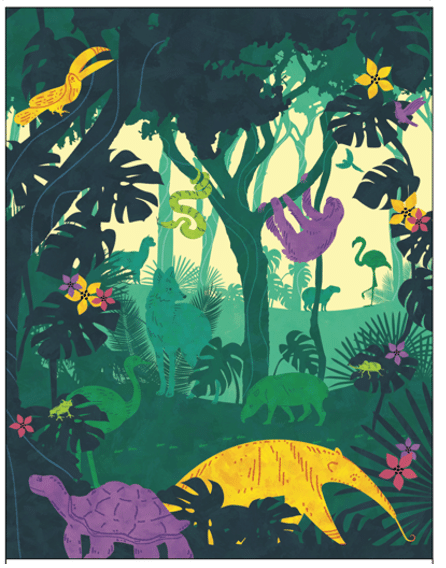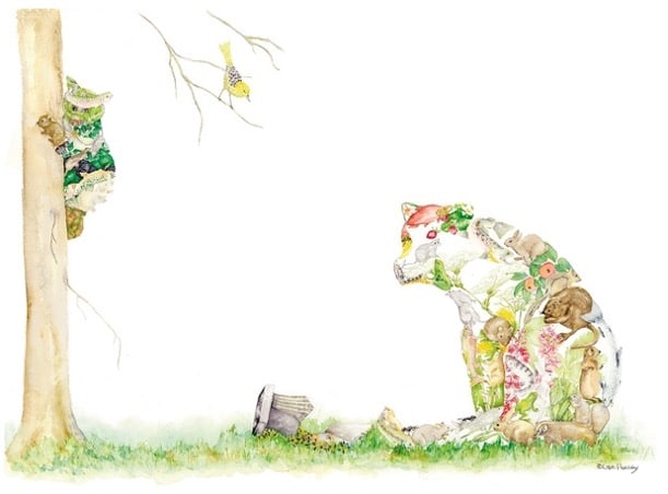 To create a successful “seek and find” graphic there needs to be an element that draws the viewer to the piece. Bright colors, fun shapes or an interesting composition are all components that create interest within a piece. It could also be an image where the “seek-and-find” catches you by surprise. For example, artist Lisa Holley creates pieces where the primary subject, like the animal, reveals itself to be a collage of everything it eats. These details add an extra layer of interest and engagement.
