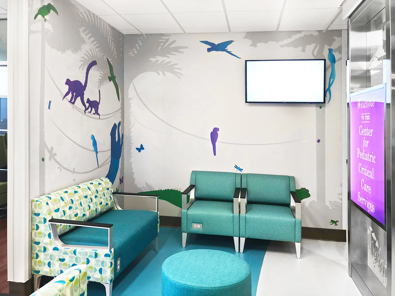 Other design finishes, including furniture, paint, and artwork, are part of the project to create a cohesive and inviting atmosphere. Wayfinding is achieved through the savannah and jungle themed animals and colorways, making navigation easier and more engaging for patients, families, and visitors. The collaborative approach between the architect, interior designer, and dedicated Skyline Art consultant ensured that the project’s design elements work together harmoniously to enhance the overall experience in the space.