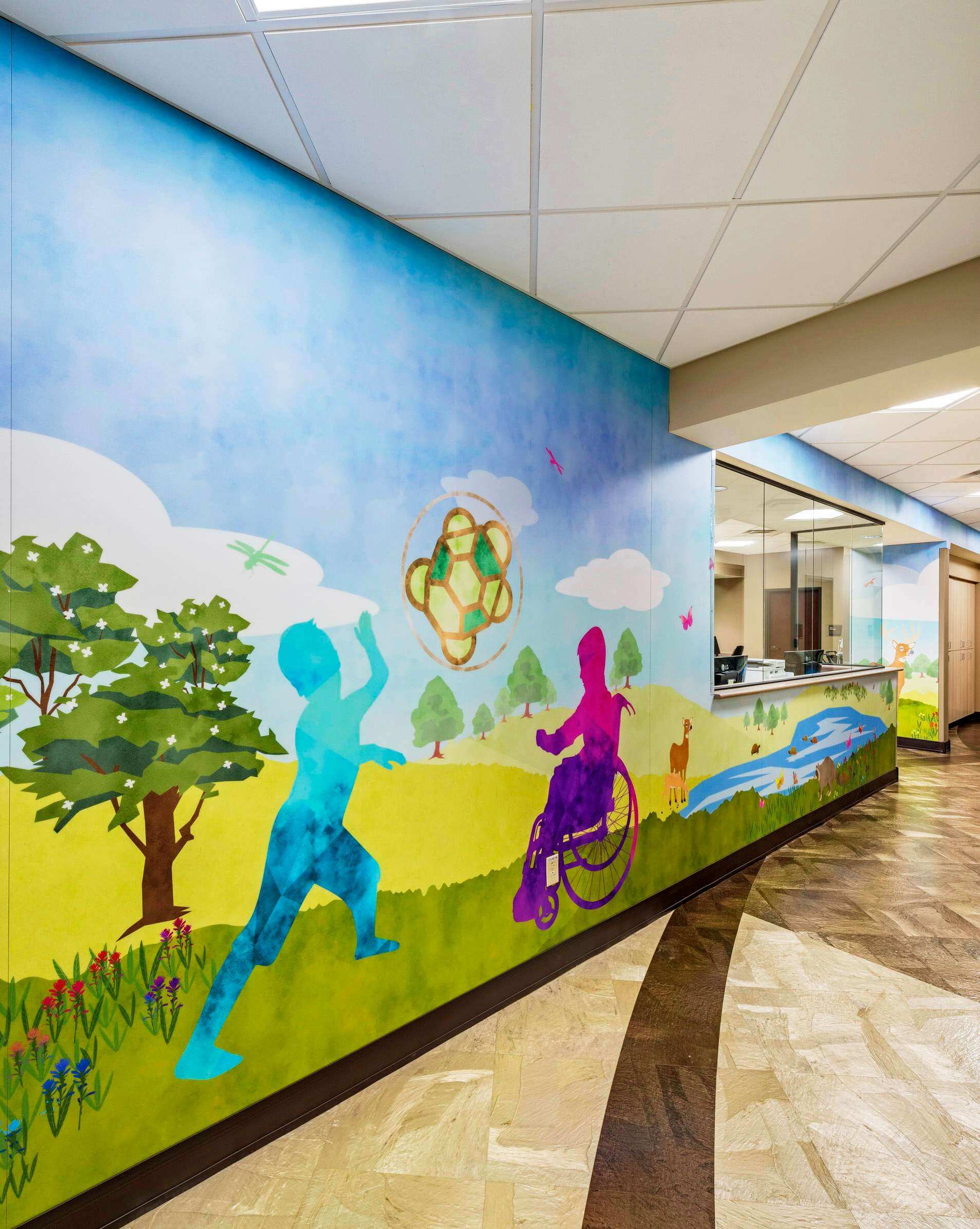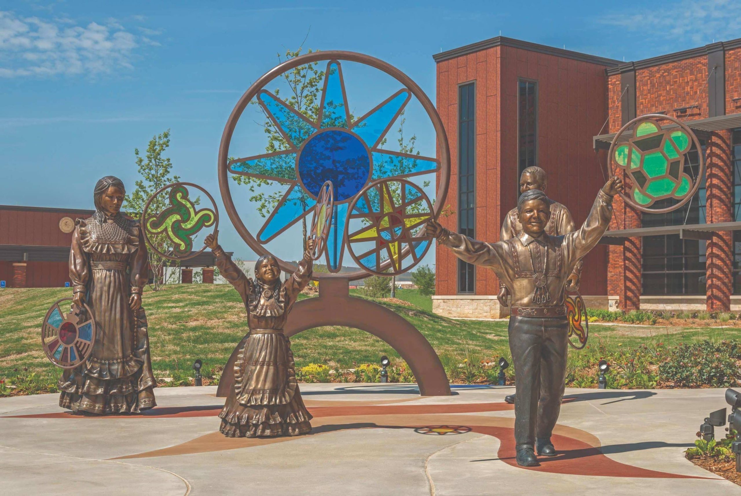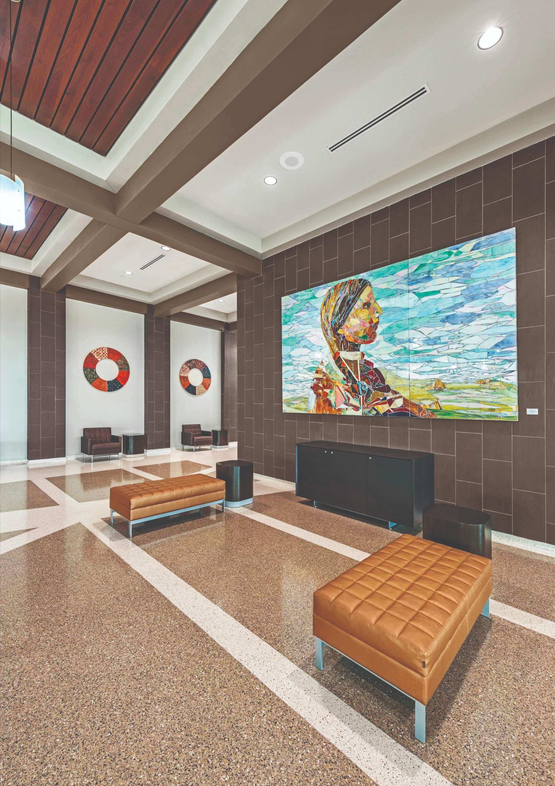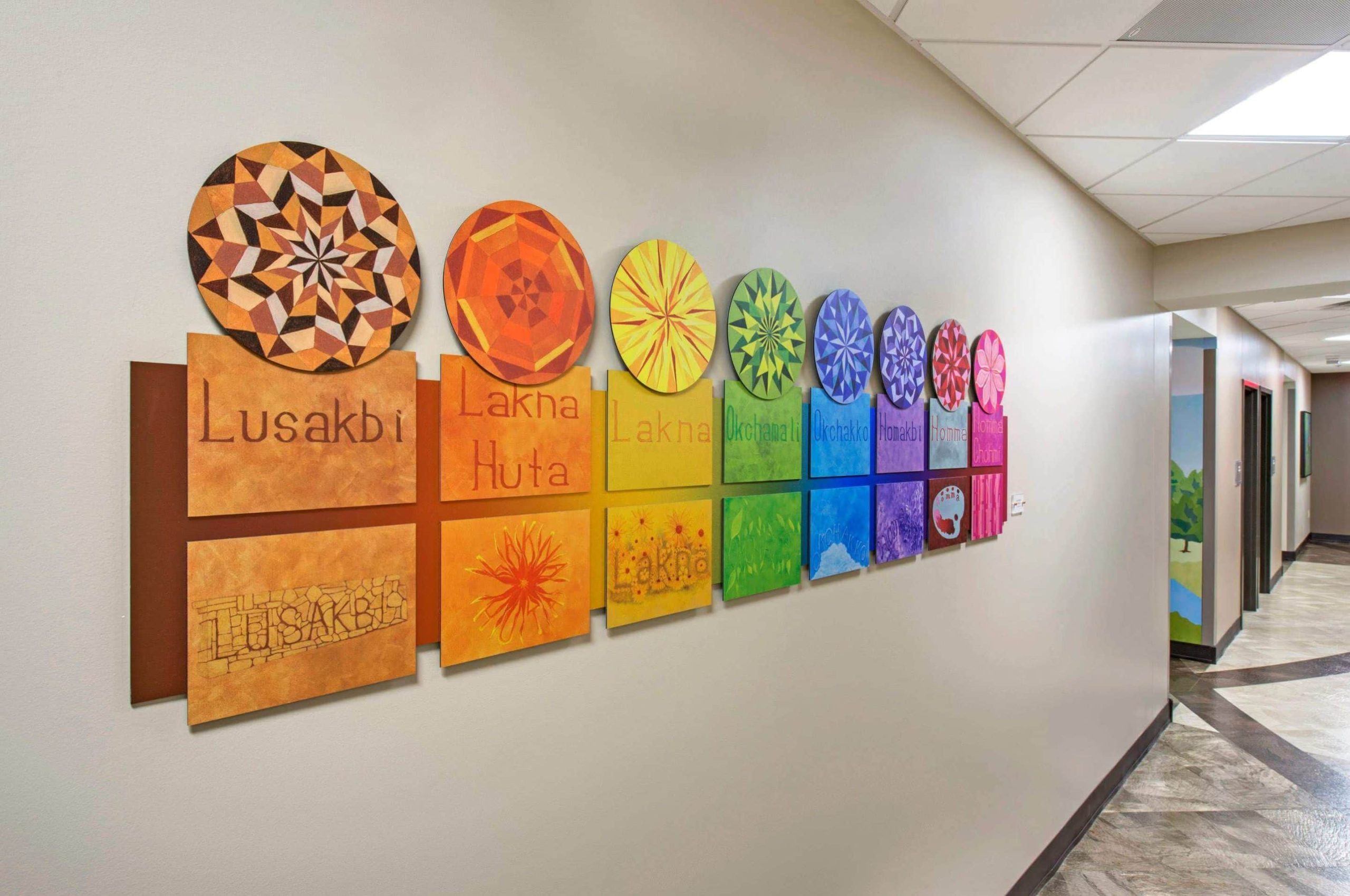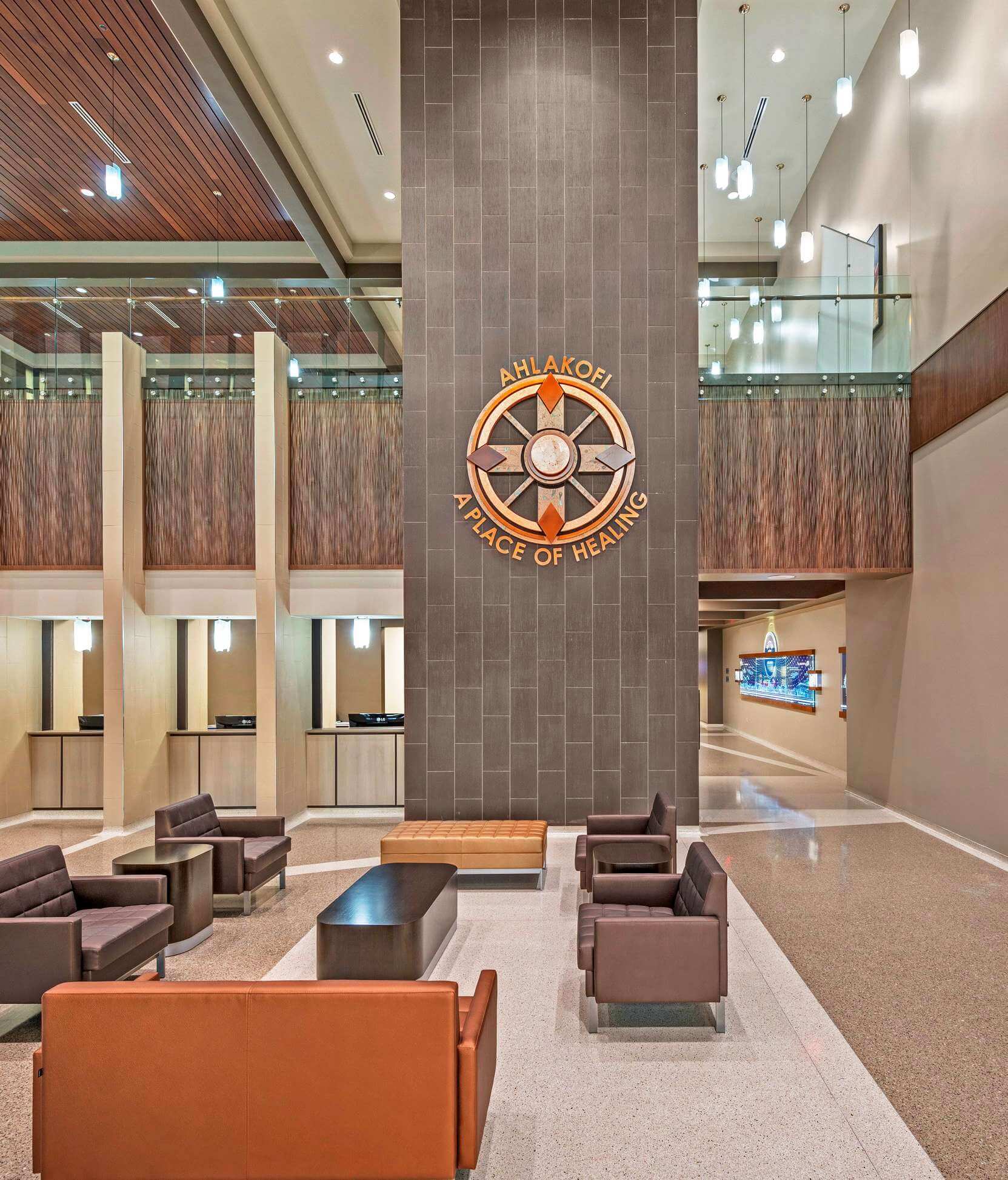 Choctaw Nation of Oklahoma launched a project for its Health Services Division, a state-of-the-art 143,000-square-foot medical center and renovation of a network of outlying clinics and wellness centers across eastern Oklahoma. They sought to create “A Place of Healing,” or in Choctaw: “Ahlakofi.” The project imparted a strong and consistent identity to provide high-quality healthcare to the Choctaw community and recognized and honored the tribe’s unique culture and history. The art program was a departure from using typical evidence-based design guidelines for artwork considered to be appropriate for healthcare facilities to meet the goals for this unique environment of care.