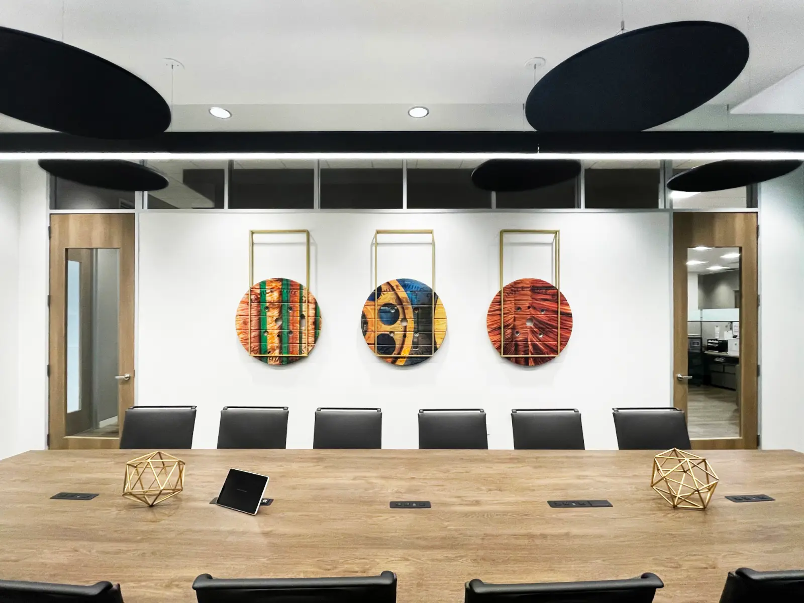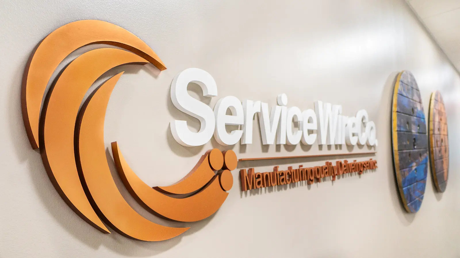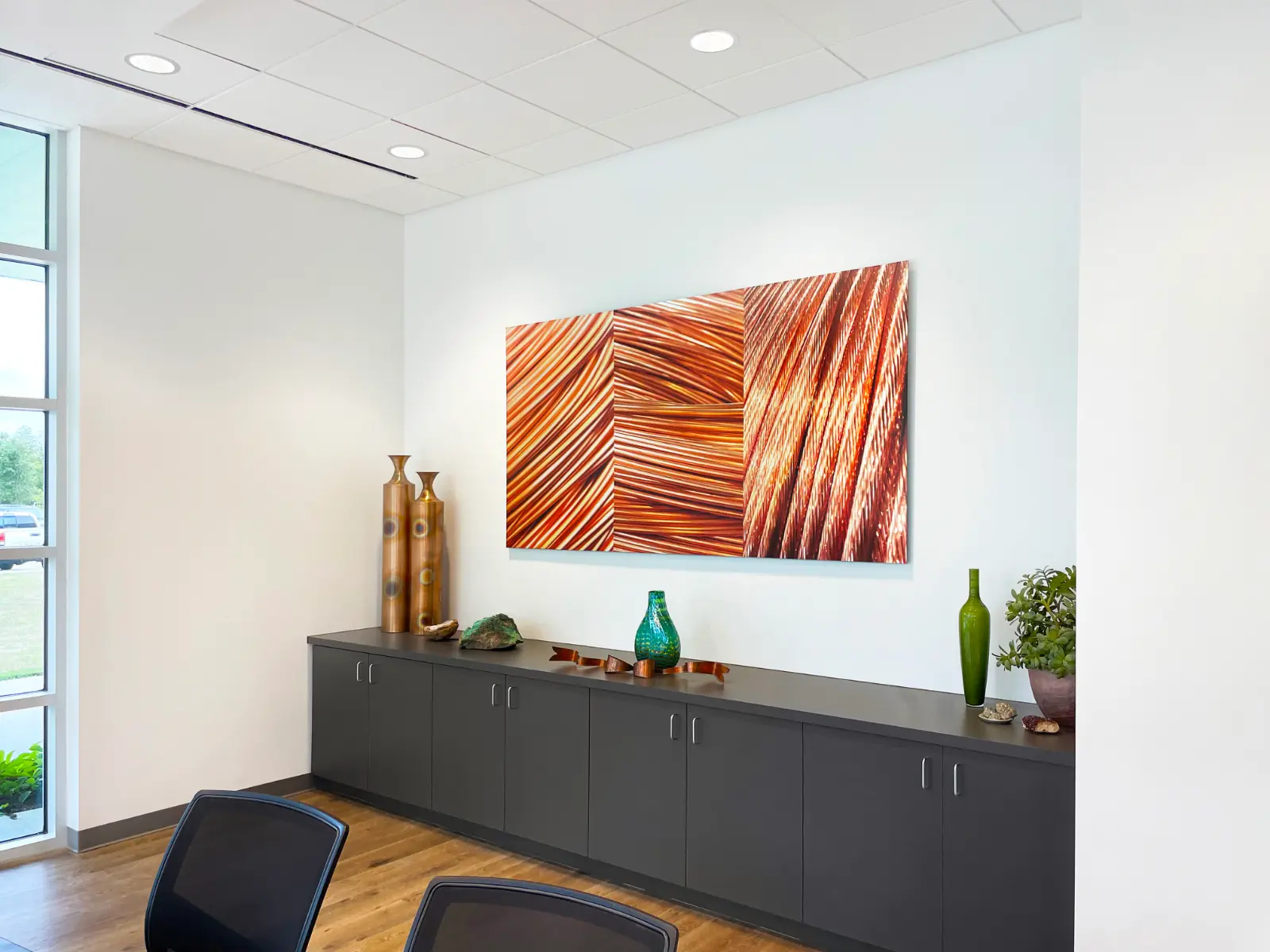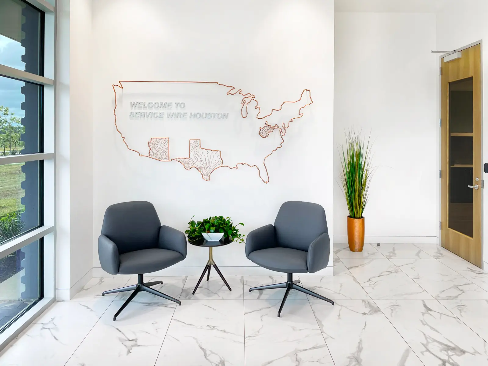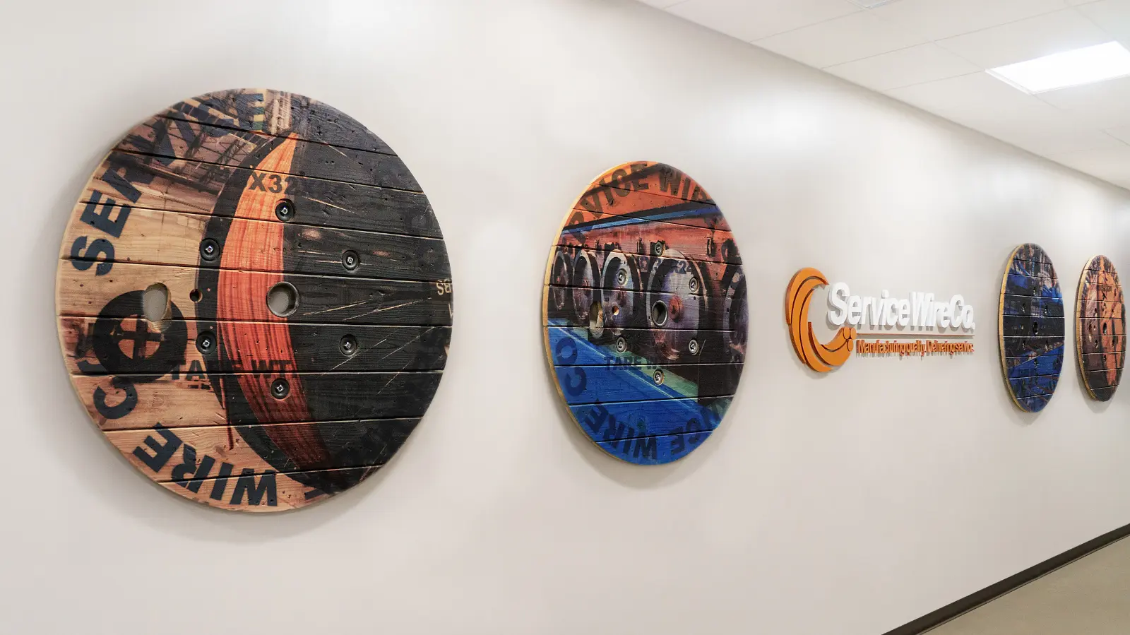Skyline Art collaborated with Service Wire to create a distinctive art program for their Sales and Operations departments. The collection includes client-facing artwork showcasing product displays and warehouse imagery that resonates with employees. The lobby’s striking centerpiece is a custom map crafted by a wire artist from Service Wire’s own materials, depicting the states where the company operates. With 90% of visuals sourced directly from the client’s facilities and product “reels” integrated as print substrates, the program authentically highlights Service Wire’s craftsmanship. It celebrates their nationwide presence through innovative, engaging design.