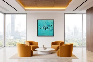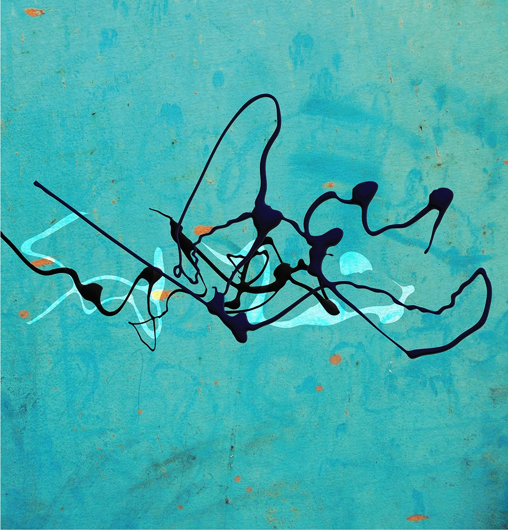 Deep blue strokes ripple across a textured sea‑green background.