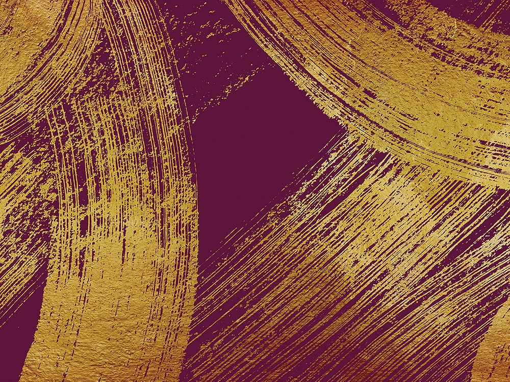 Bold gold brushstrokes sweep across a deep burgundy backdrop, creating a textured, modern composition.