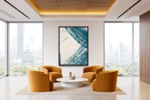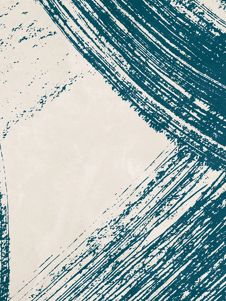 Bold blue brushstrokes sweep across a deep neutral backdrop, creating a textured, modern composition