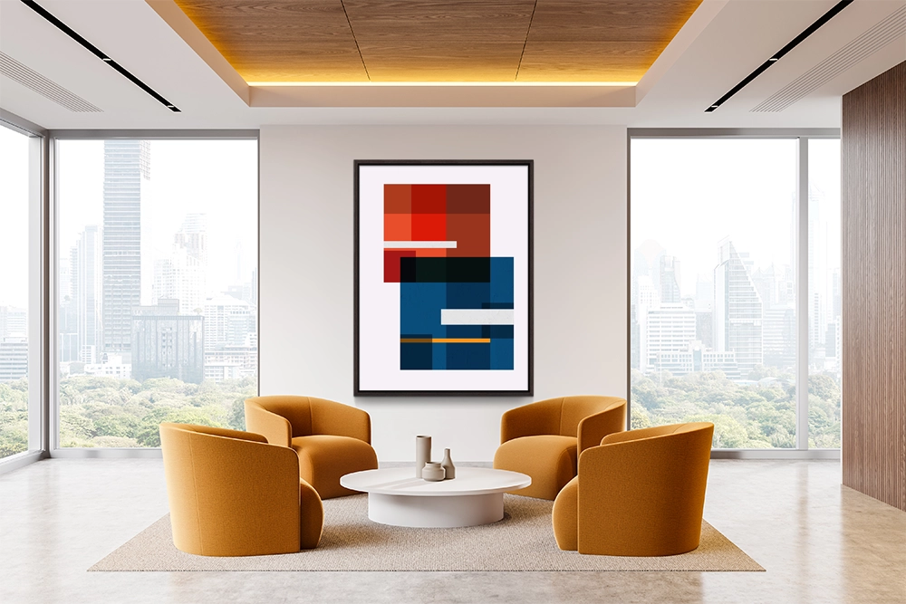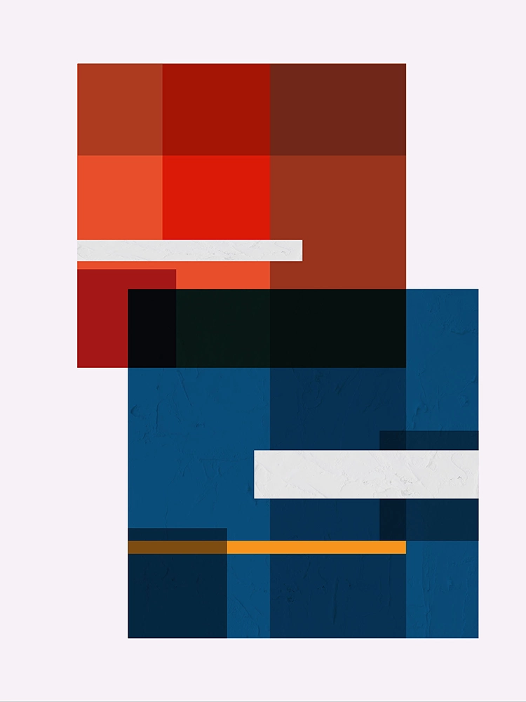 Bold geometric composition with a red, deep blues, and accents of black and gold.