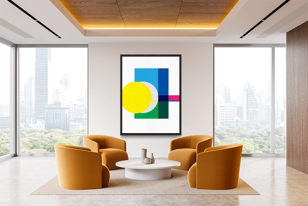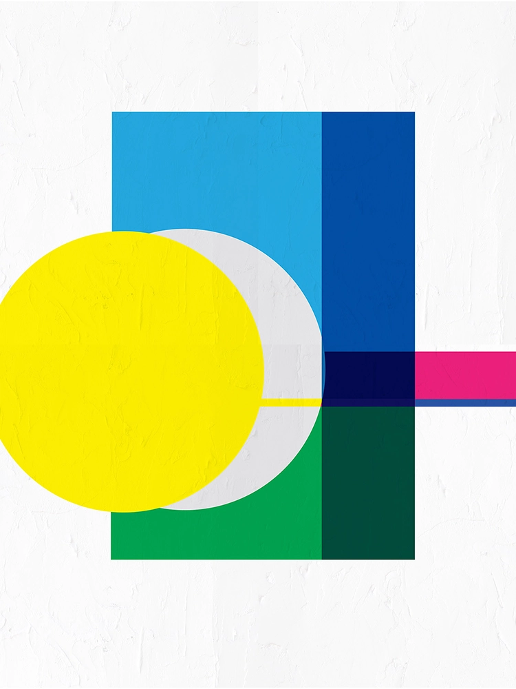 Vibrant abstract with bold color blocks in yellow, blue, green, and pink.