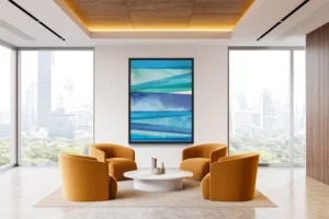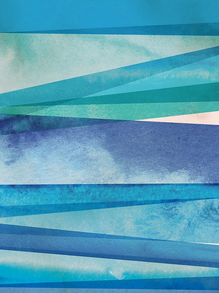 Textural elements and linear strokes in varying blue tones build visual complexity.