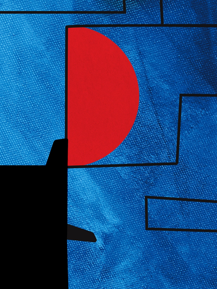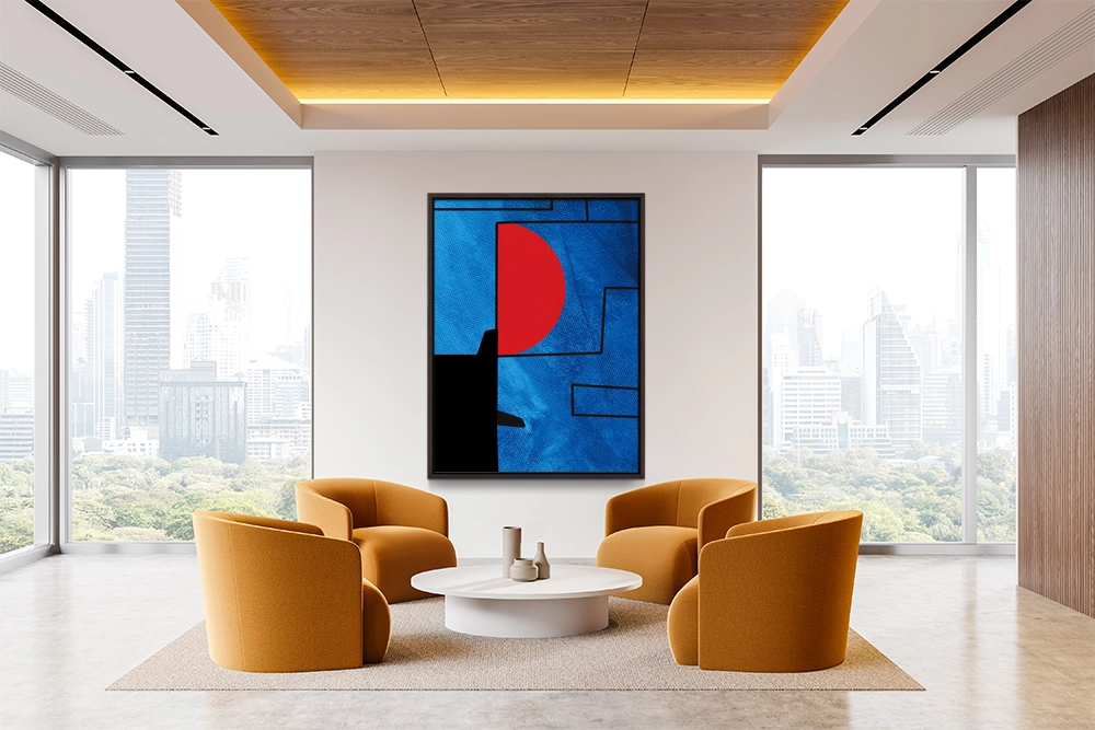 A striking contrast of bold red and deep blue with black accents with a textured finish.