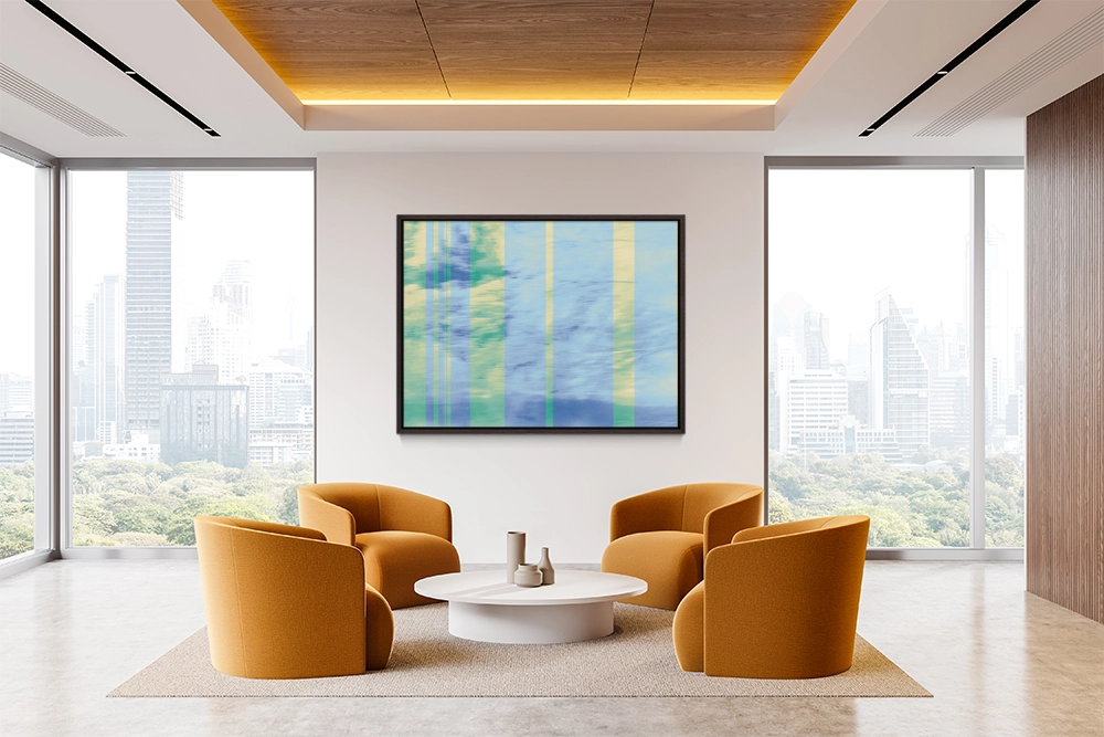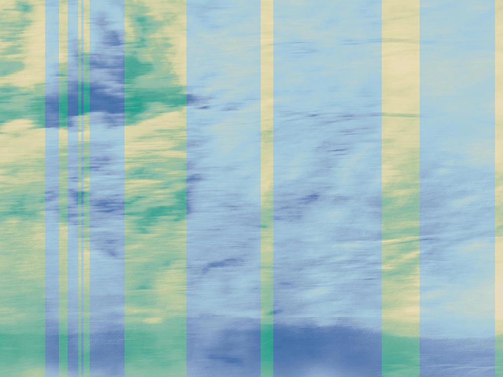 Soft blue and green abstract with vertical translucent stripes, evoking reflections of sky and light on water.