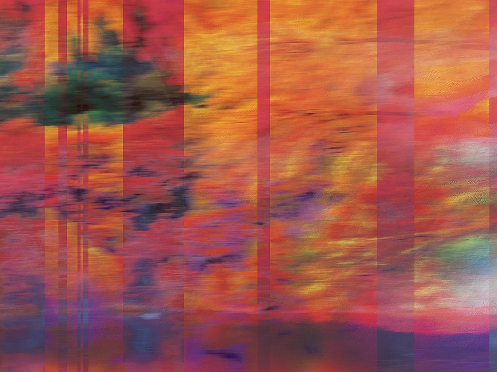 Vibrant abstract of autumn foliage reflected on water, layered with vertical translucent stripes for a dynamic, painterly effect.
