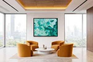 Vibrant green and teal patterns swirl across the surface, creating an impression of movement and depth. The flowing shapes and color play offer a sense of tranquility.