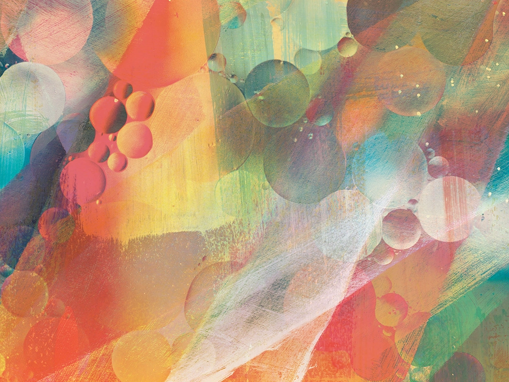 Bubbles and brushstrokes interplay in this vibrant abstract of red, orange, and green, accented by touches of blue.
