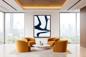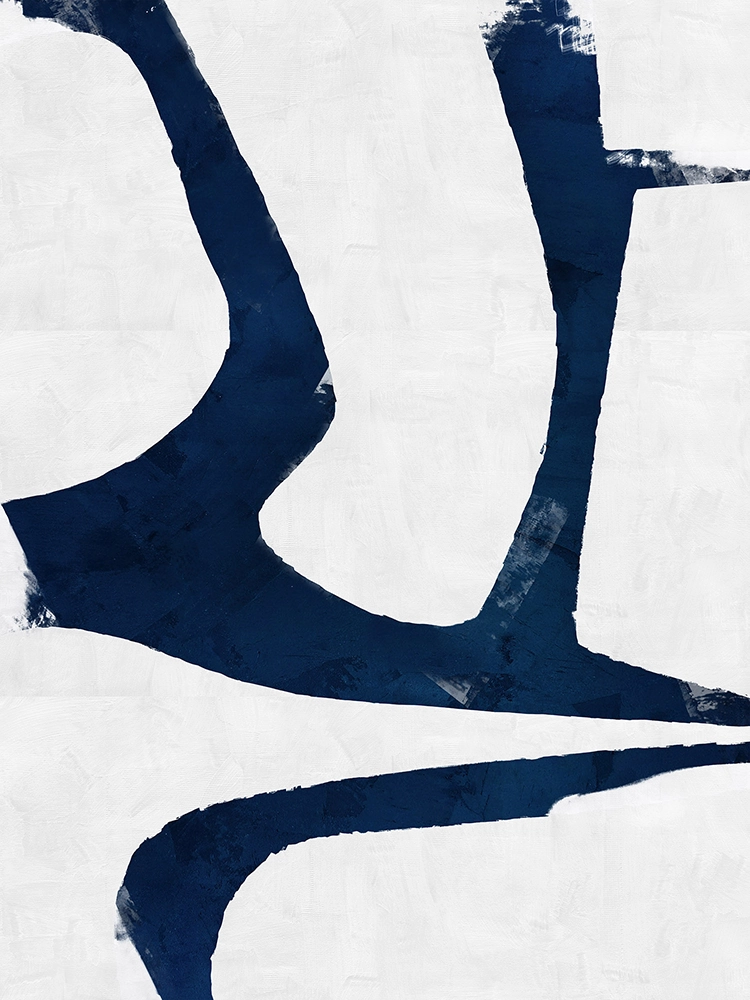 Bold navy forms sweep across a textured white background.