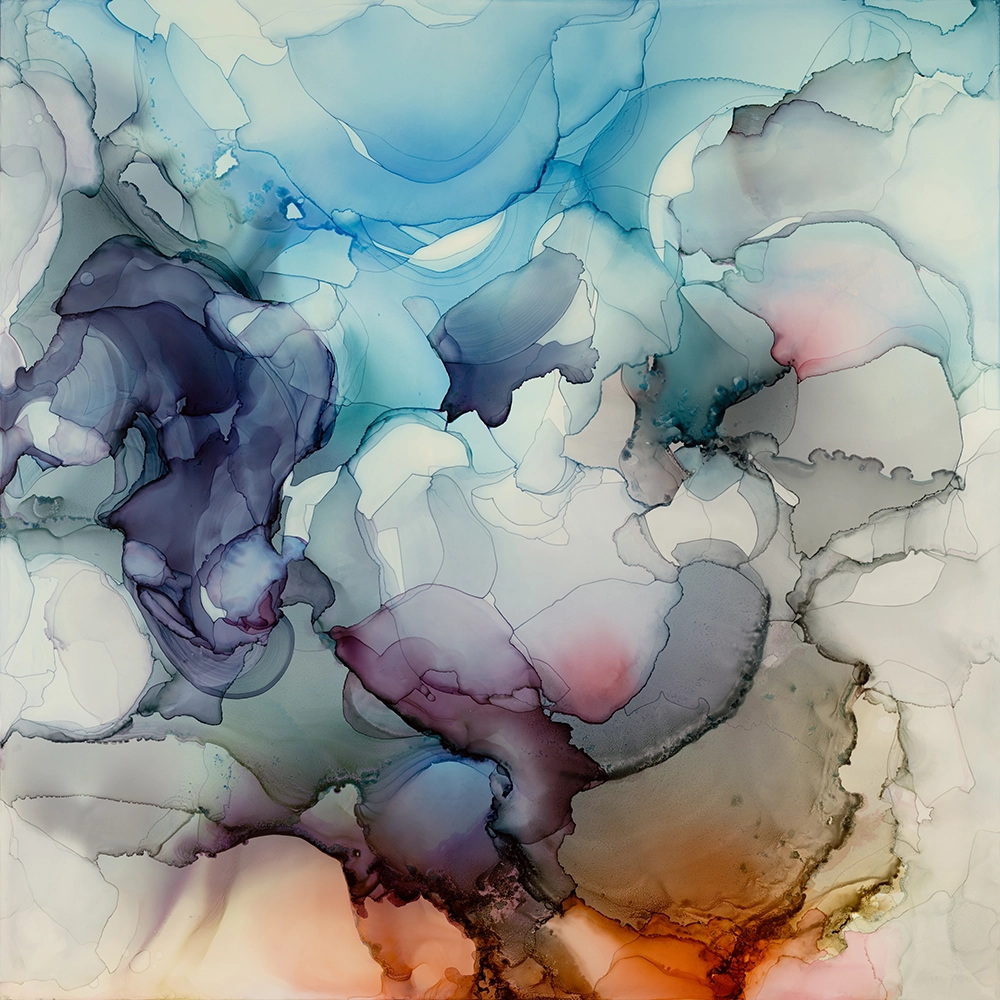Austin, Texas–based painter Andrea Pramuk creates organic abstractions by blending paint pouring techniques with image lift and transfer, layered with delicate brushwork.