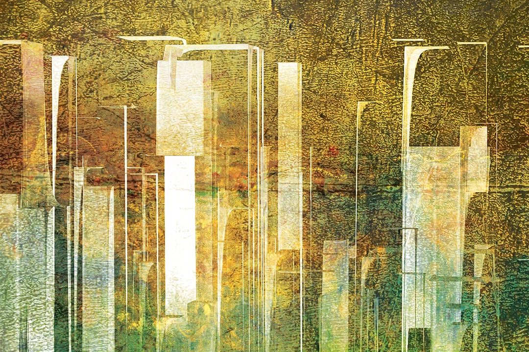 A golden skyline shines through a surreal hazy smog.