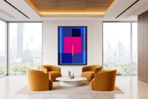 Bold geometric composition featuring vibrant magenta, layered blues, and a vertical orange accent.