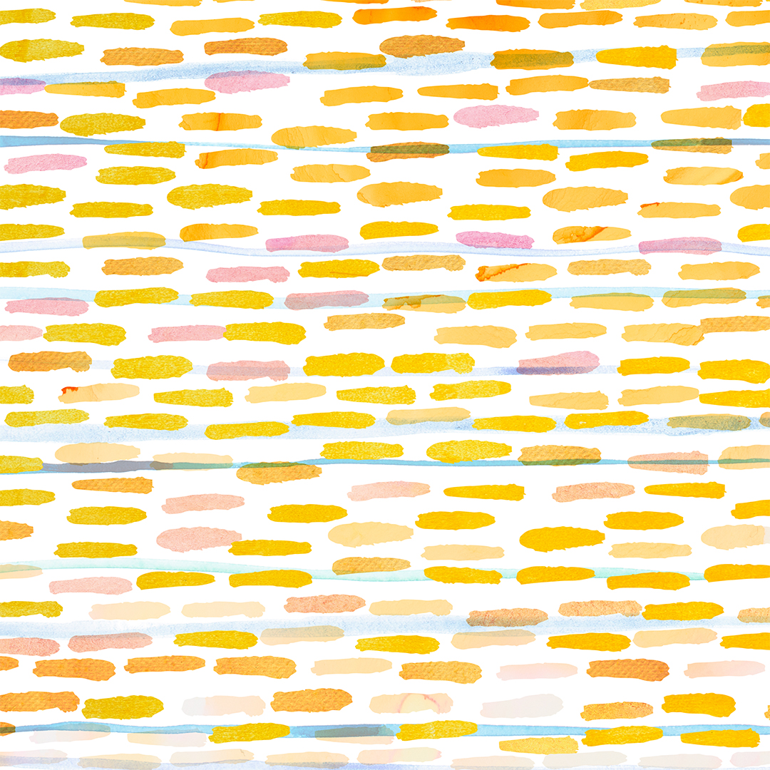 Warm golden tones mingle playfully with pink, framed by calm blue lines.