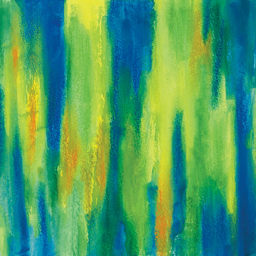 A painterly abstract in blue, green, yellow, and hints of orange.