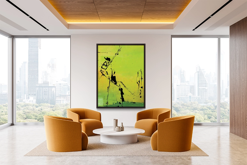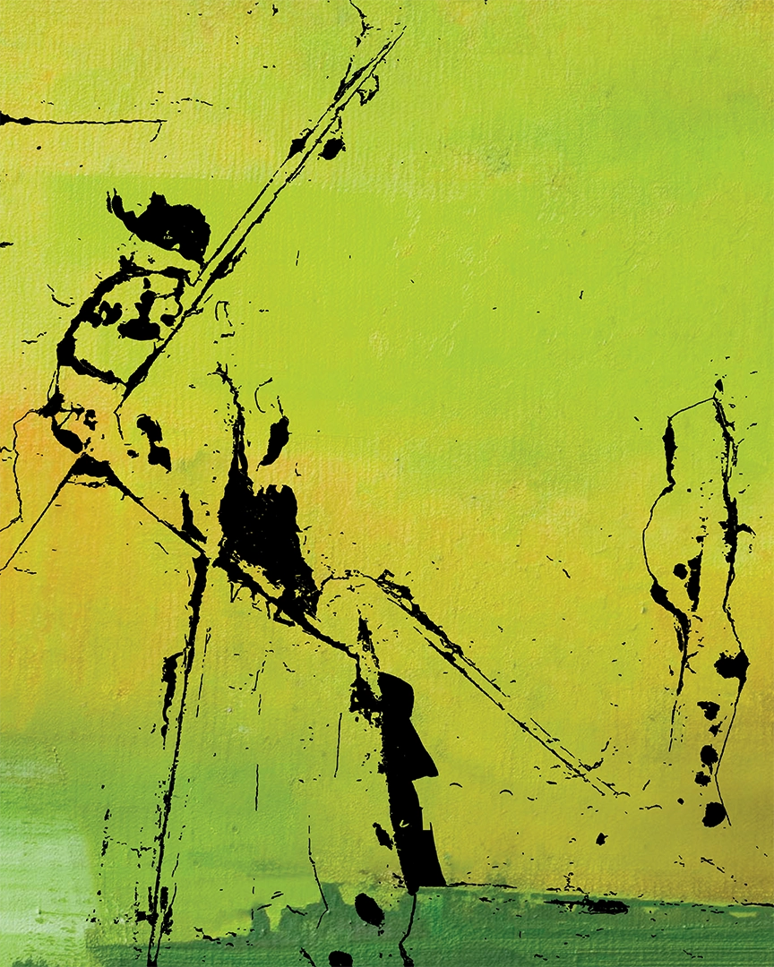 A bright gradient of green and yellow is disrupted by splintered black lines, giving the artwork a charged, electric atmosphere.