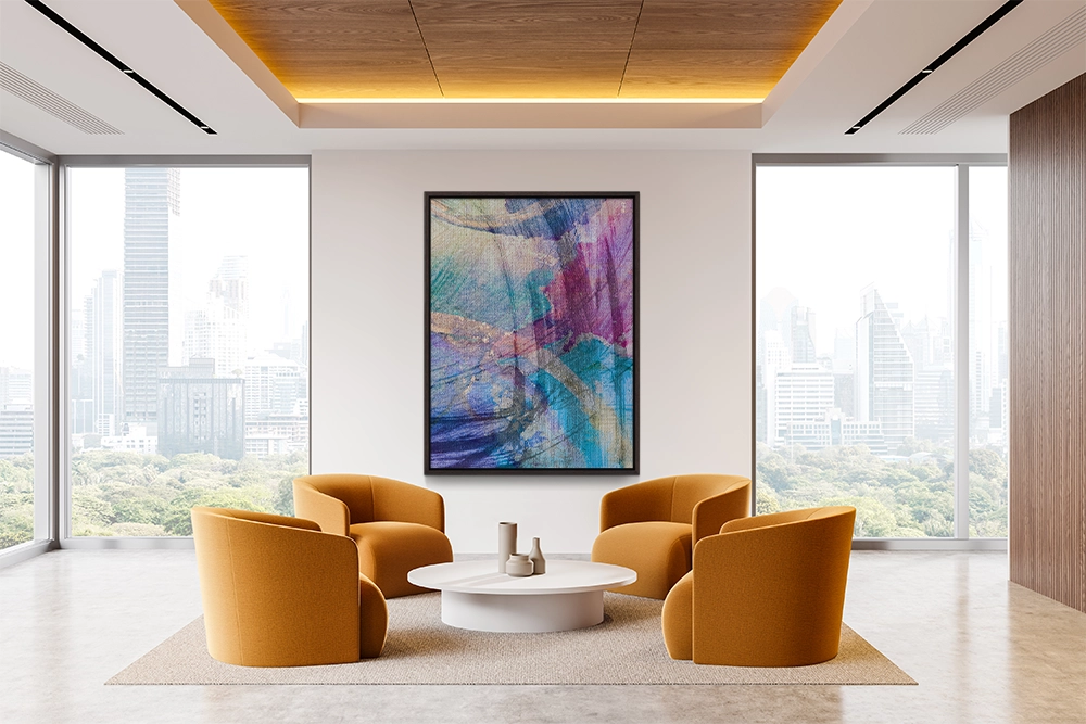 Swirling patterns in purples, blues, and greens create a dynamic and vibrant composition. The overlapping brushstrokes add depth and movement.