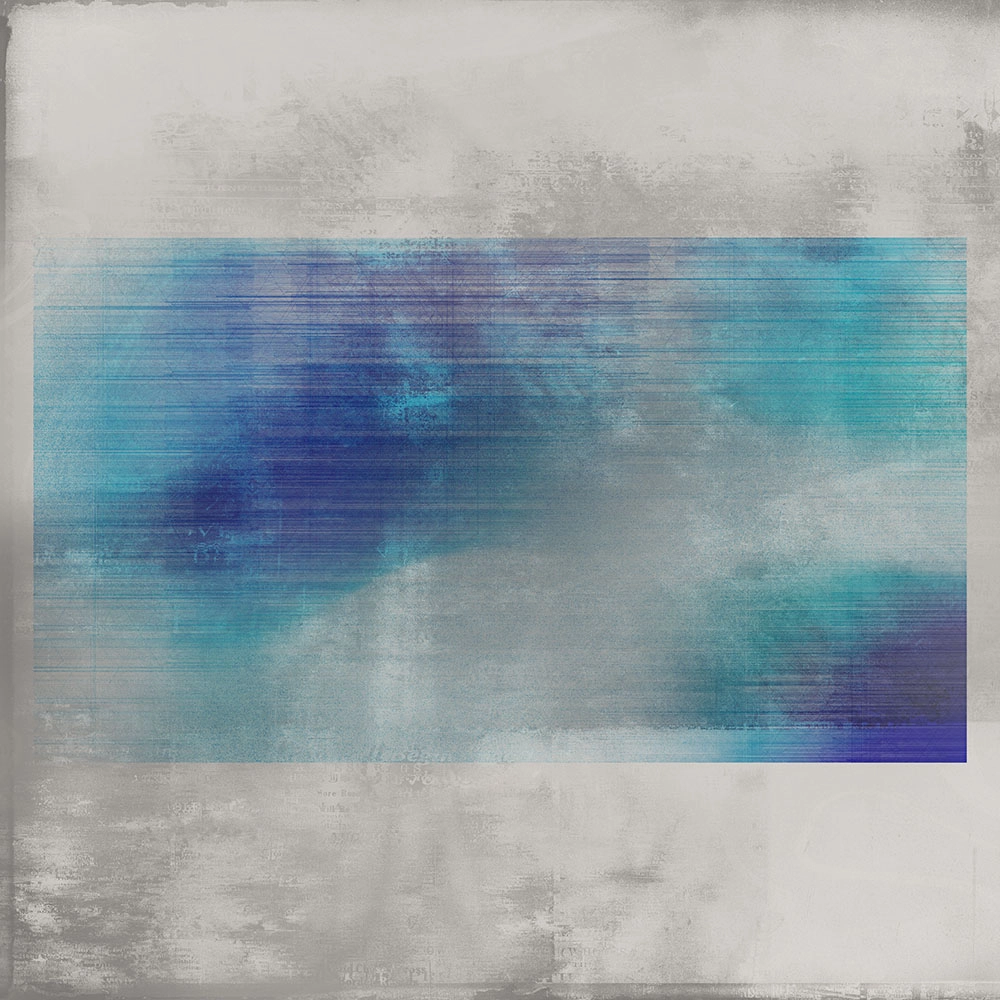 Soft turquoise and deep blue layers merge with misty textures and horizontal striations.