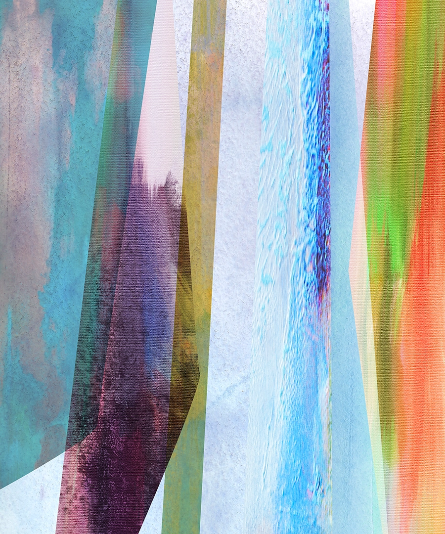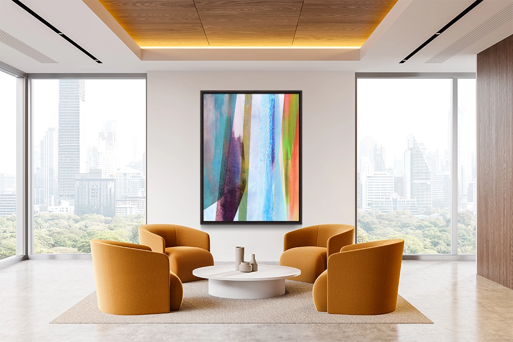 A luminous abstract piece of flowing vertical forms in cool blues, soft violets, and vibrant citrus hues, blending delicate textures with bold color to evoke a serene yet energetic modern aesthetic.