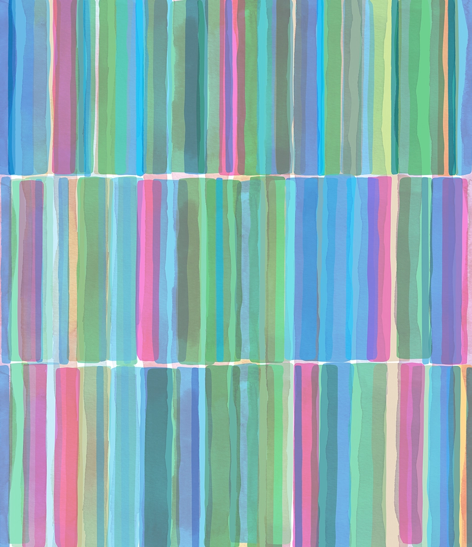 A rhythmic arrangement of soft, vertical color bands in tones punctuated by pinks, blues, and greens.