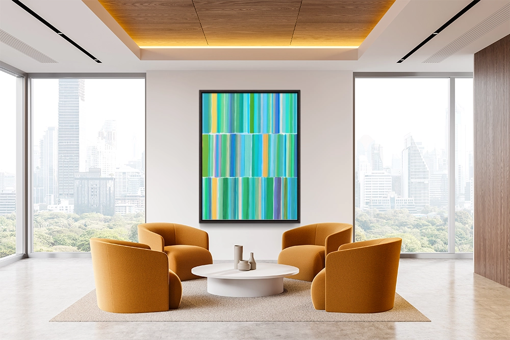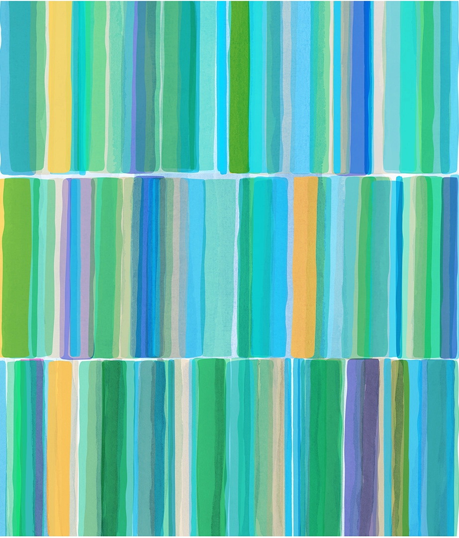 A rhythmic arrangement of soft, vertical color bands in tones punctuated by blues, greens, and yellow.