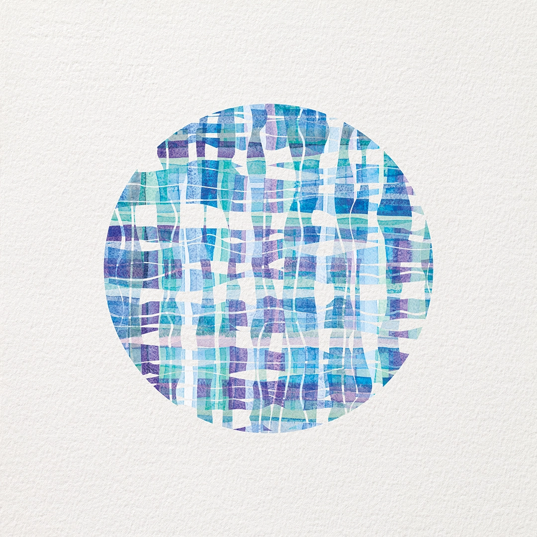 Abstract circular artwork featuring intersecting blue, green, and white grid-like lines with a textured, watercolor effect.