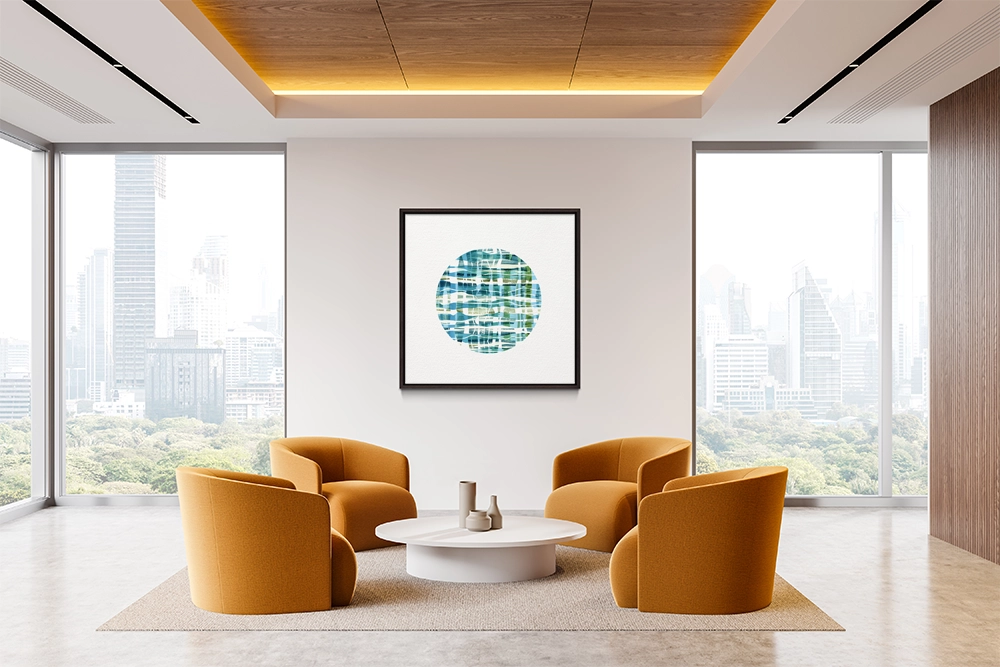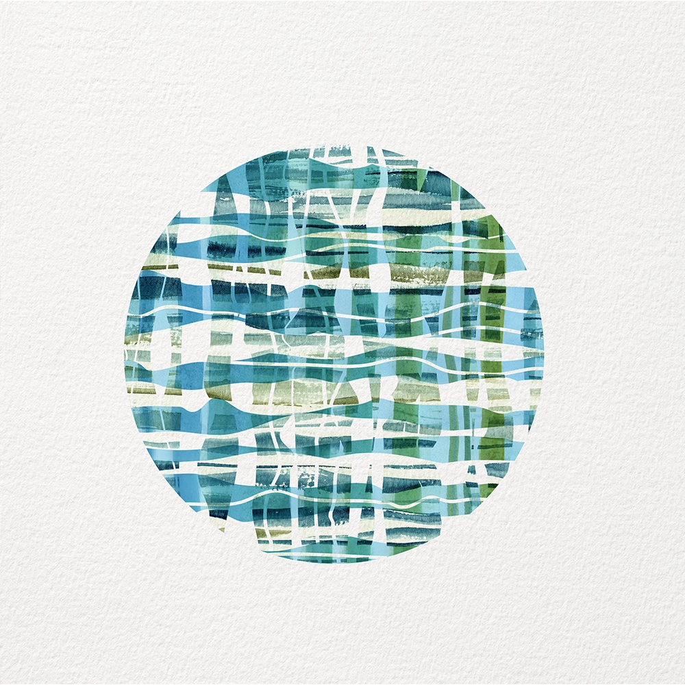 Abstract circular artwork featuring intersecting blue, green, and white grid-like lines with a textured, watercolor effect.