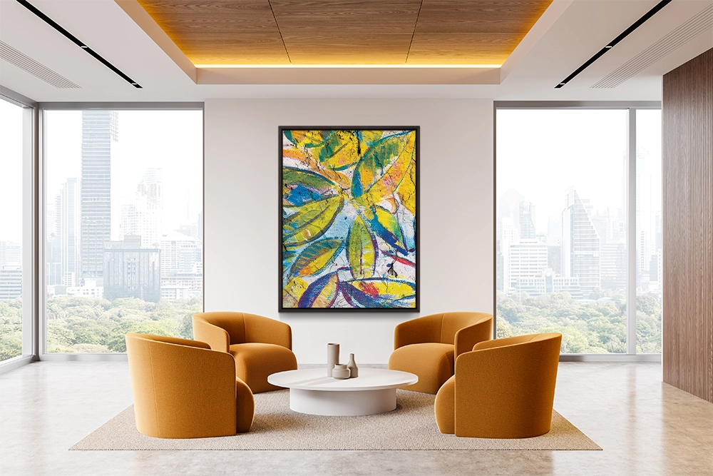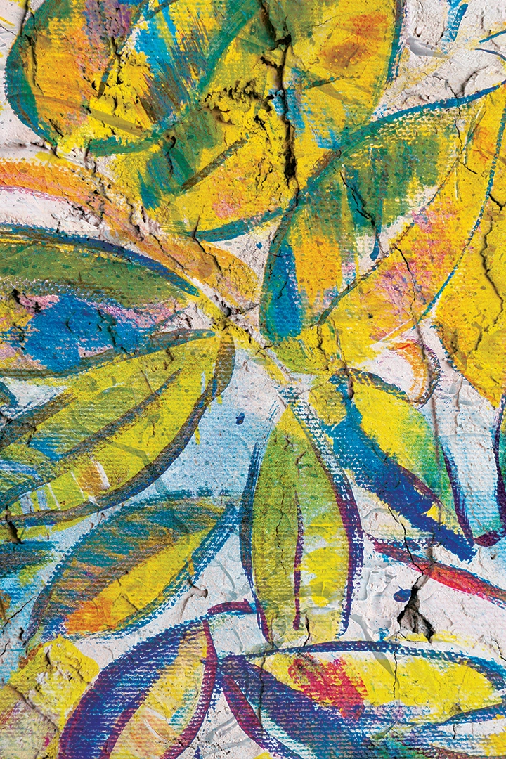 Striking mural of bright wide leaves cover the space in a blast of longing for adventure in nature.