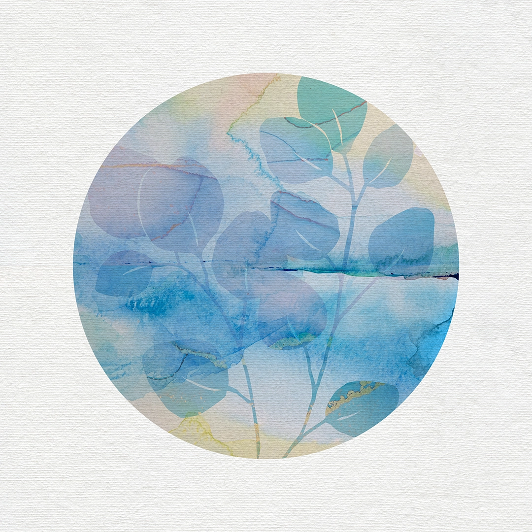 Subtle leaves emerge through layered watercolor blues, balancing horizon and ethereal depth.
