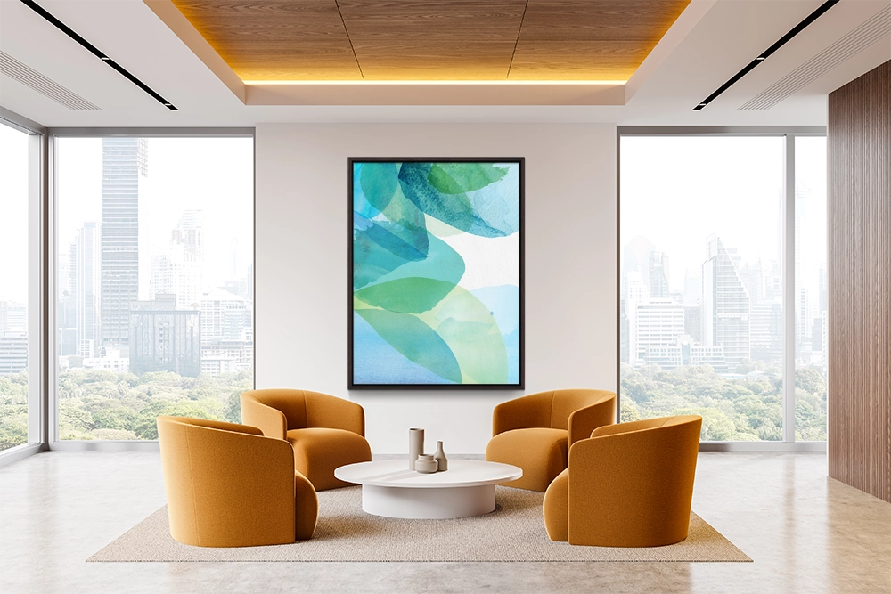 Abstract watercolor petals in soft blue and green tones.
