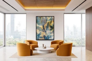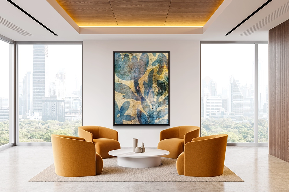 Weathered textures frame abstract blue florals, whispering nature’s resilience through time.