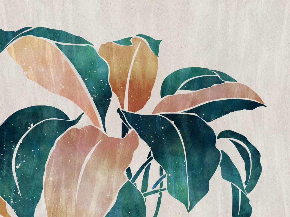 Lush foliage carries sunlit warmth, blending green silhouettes with copper and amber tones.