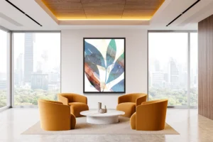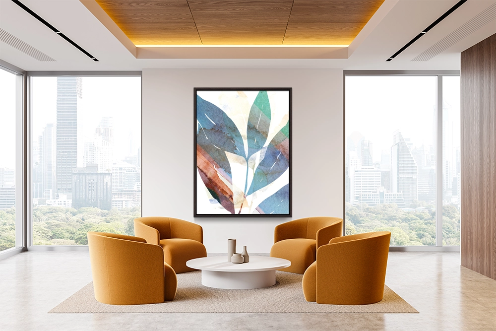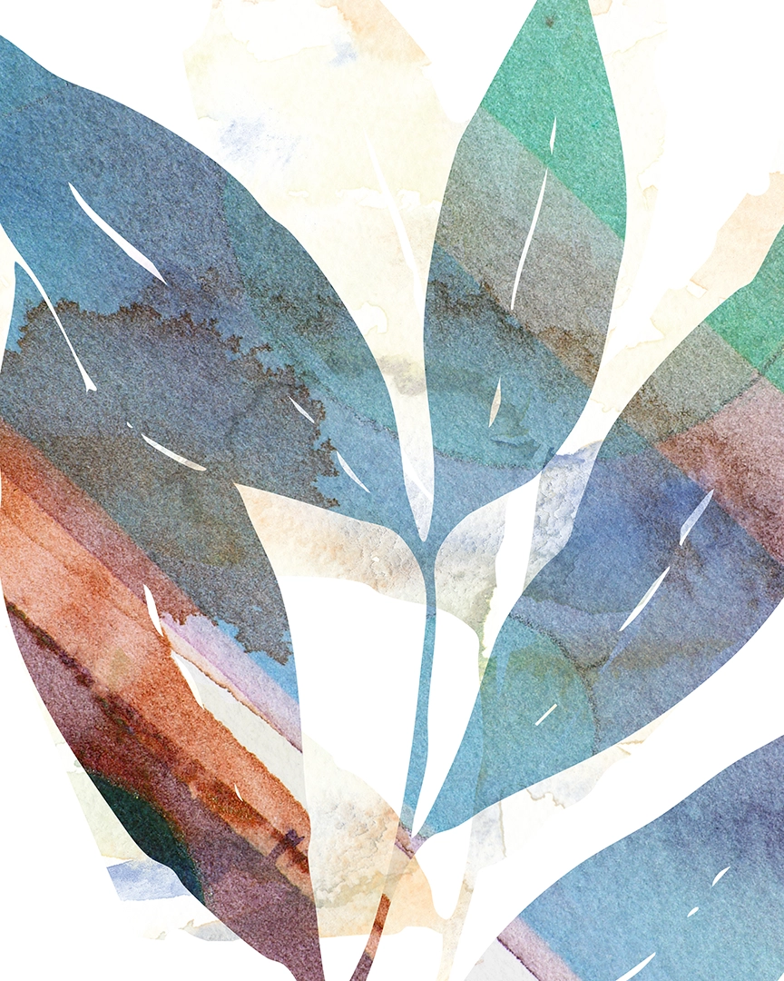 Watercolor leaves overlap in earthy blues and reds, evoking natural strength.