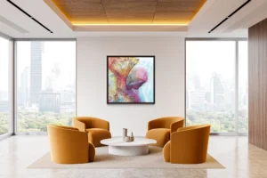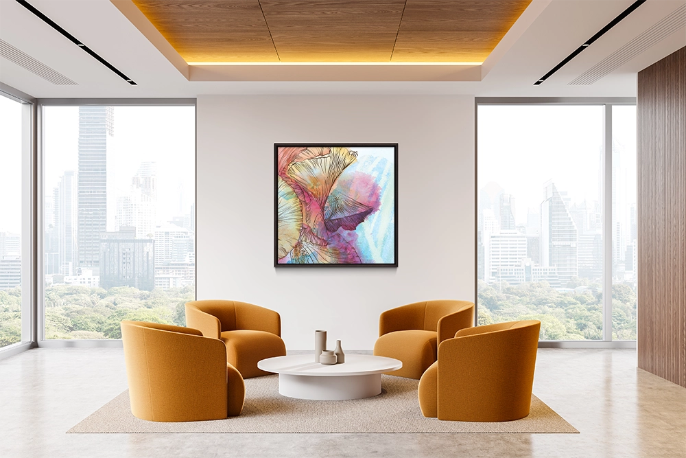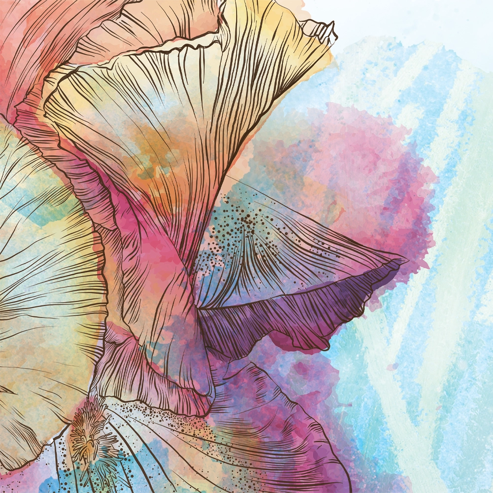 Delicate floral lines embrace vibrant watercolor washes, merging structure with dreamlike abstraction.