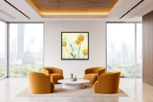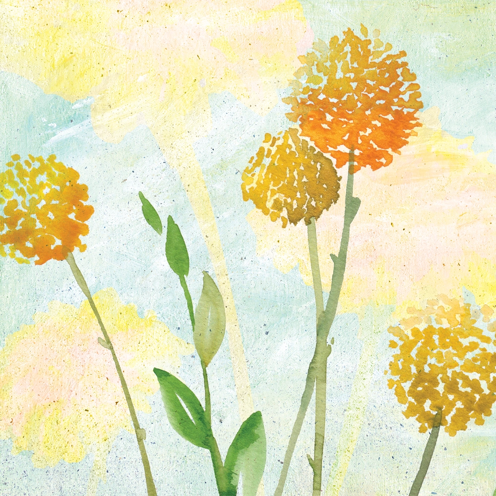 Warm watercolor blossoms sway gently, glowing golden against soft skies of dawn.