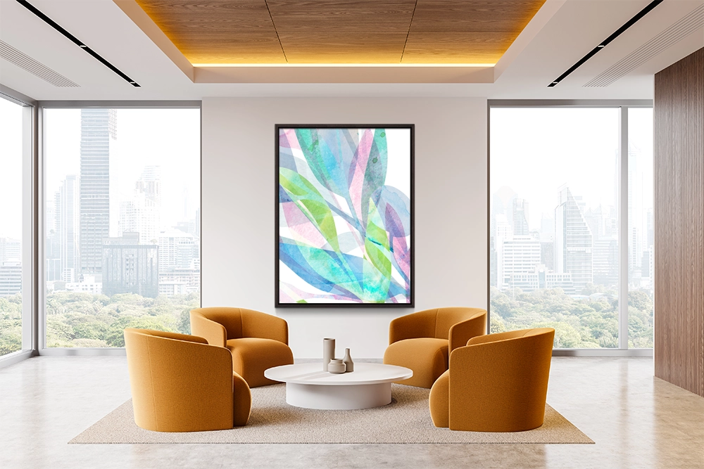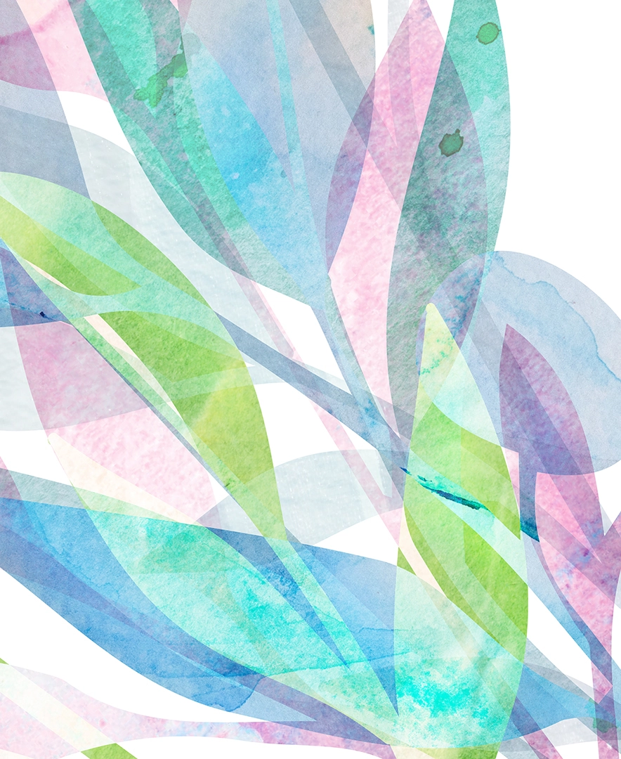 Delicate translucent leaves weave upward, merging turquoise, lilac, and fresh green washes.