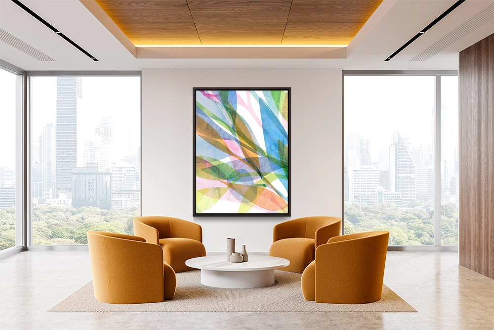 Overlapping leaves cascade dynamically, vibrant with orange, green, and aqua watercolor layers.