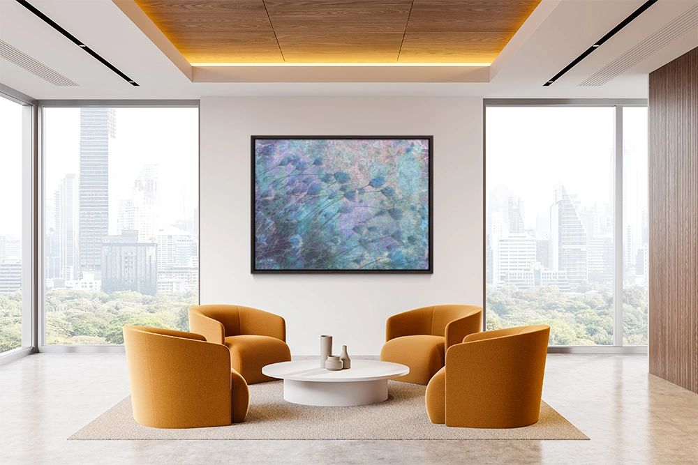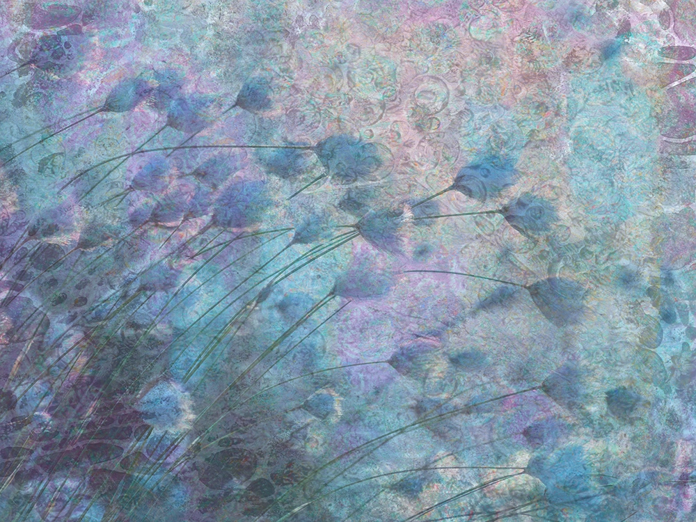 Soft blue and lavender blossoms drift across textured layers with ethereal, dreamlike movement.