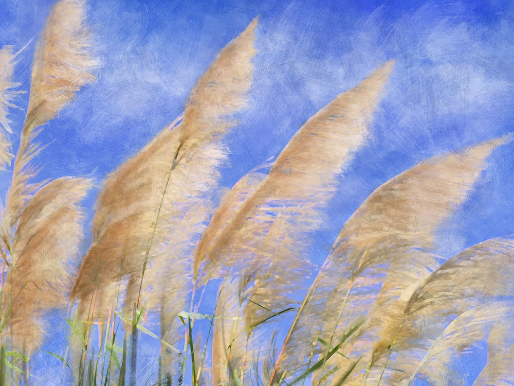 A macro of beach seagrass set against a vivid blue sky backdrop.