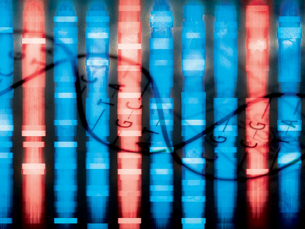 Visualizes DNA sequencing with red-blue columns, transparent helix, and base letters.