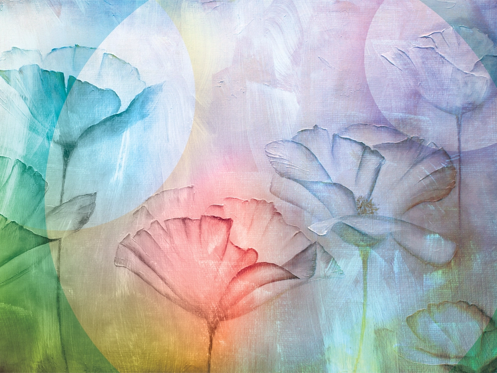 Soft pastel flowers emerge through translucent circles, radiating serenity and gentle wonder.
