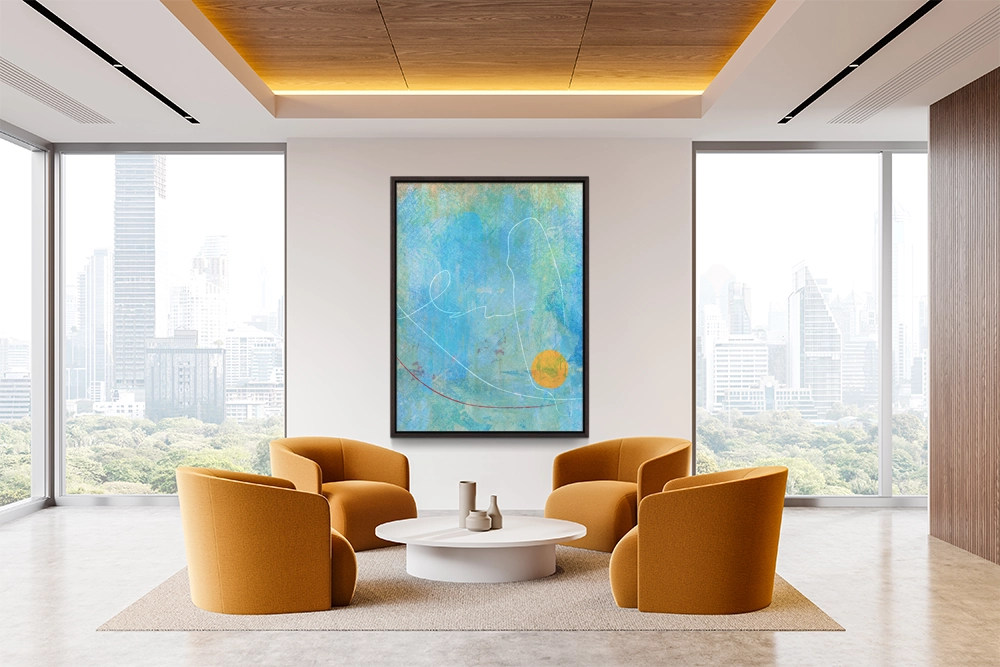 Soft layers of blue and green wash together like sky meeting sea, while a bright golden circle anchors the composition.