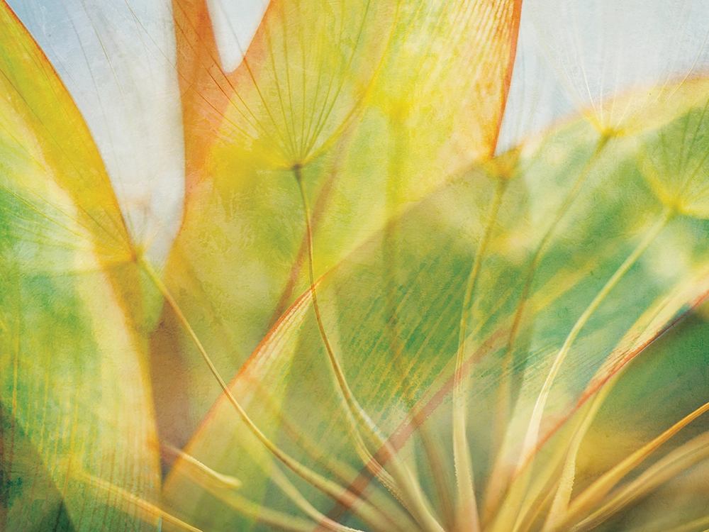 Abstract botanical captures the gentle light filtering through green, yellow, and orange leaves.
