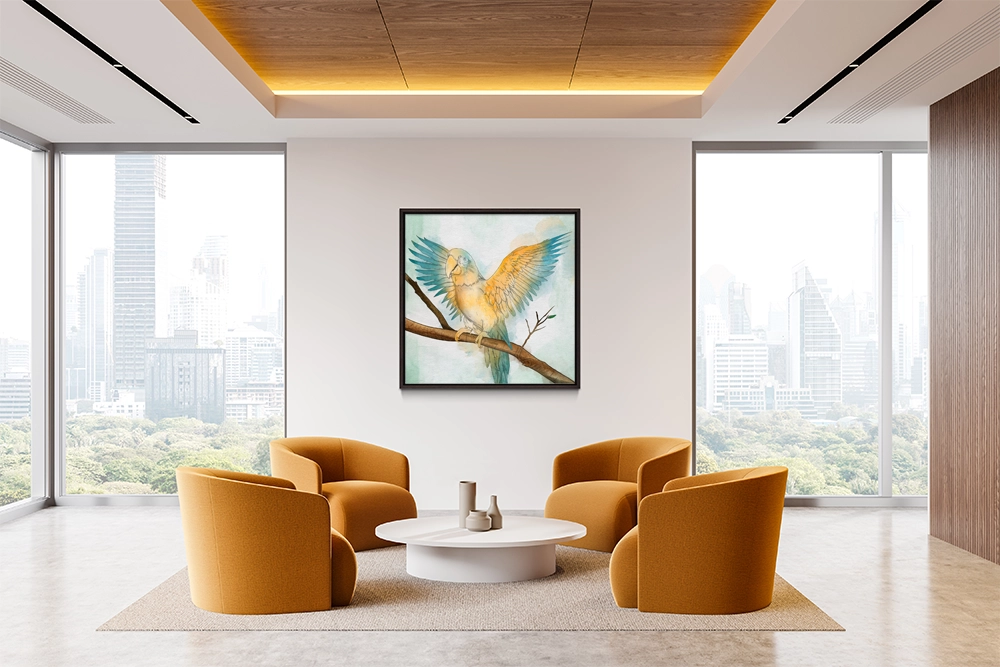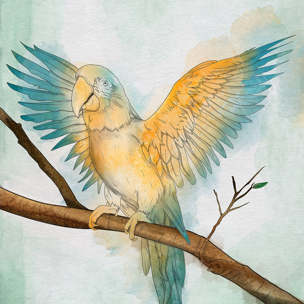 Watercolor parrot perched on a branch, wings extended in mid-motion.