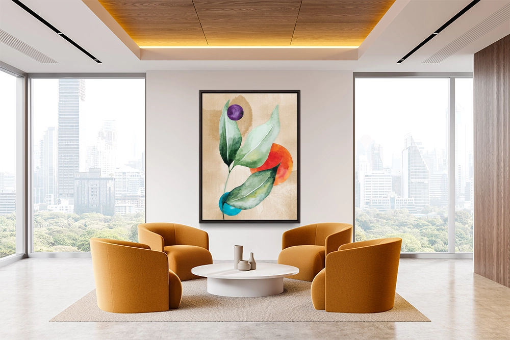 Green leaves rise gracefully, accented by bold circles of purple, orange, blue.