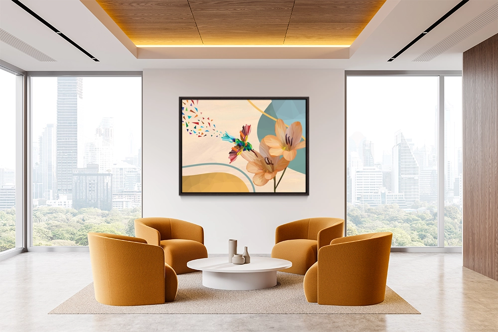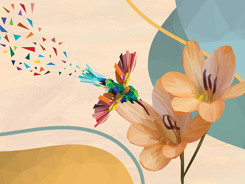 Colorful polygonal hummingbird approaches stylized orange flowers on soft background.
