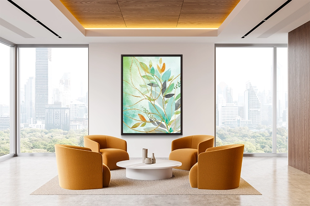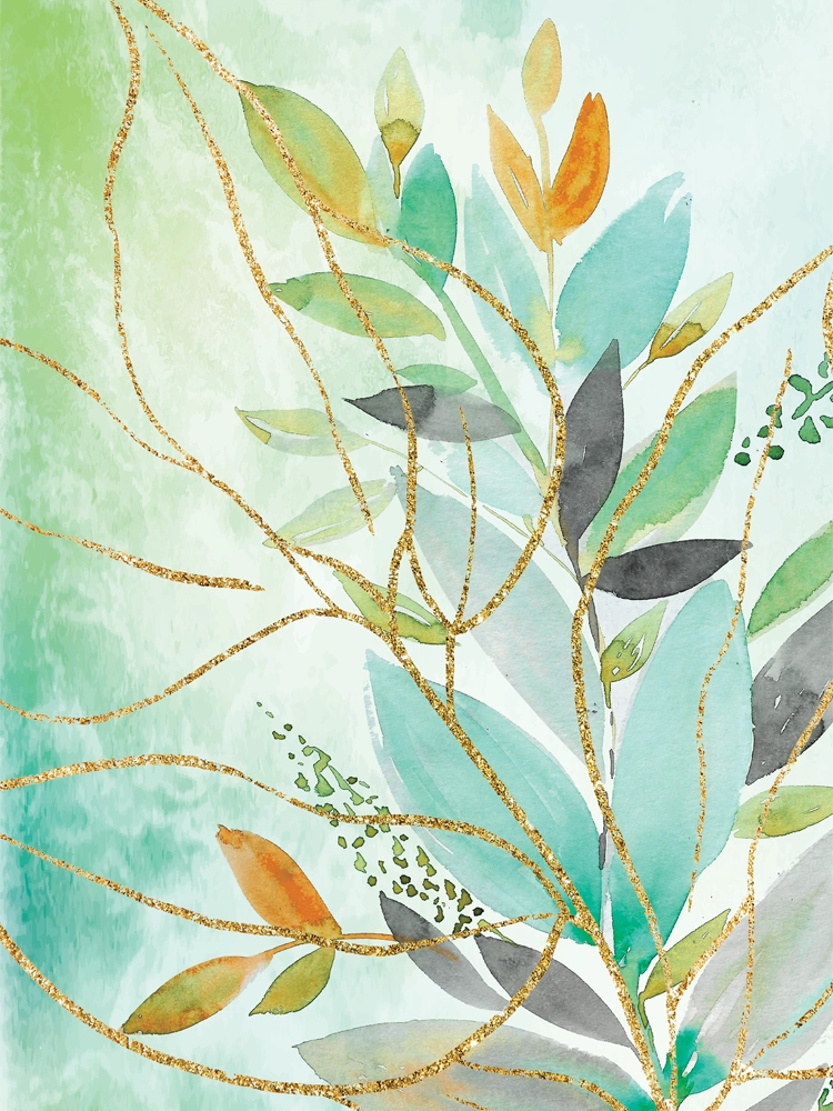 Colorful layered leaves intertwine with shimmering gold lines, radiating energy and elegance.