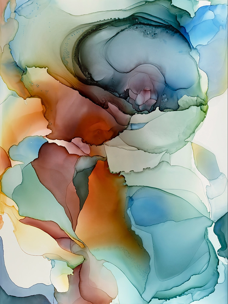 Austin, Texas–based painter Andrea Pramuk creates organic abstractions by blending paint pouring techniques with image lift and transfer, layered with delicate brushwork.